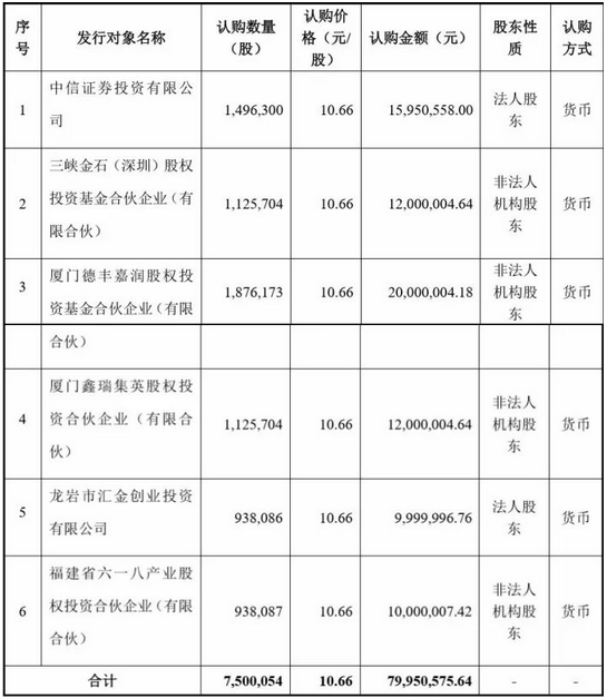 其中,中信證券認(rèn)購(gòu)1595.06萬(wàn)元;三峽金石(深圳)股權(quán)投資基金合伙企業(yè)(有限合伙)認(rèn)購(gòu)1200萬(wàn)元;廈門德豐嘉潤(rùn)股權(quán)投資基金合伙企業(yè)(有限合伙)認(rèn)購(gòu)2000萬(wàn)元。