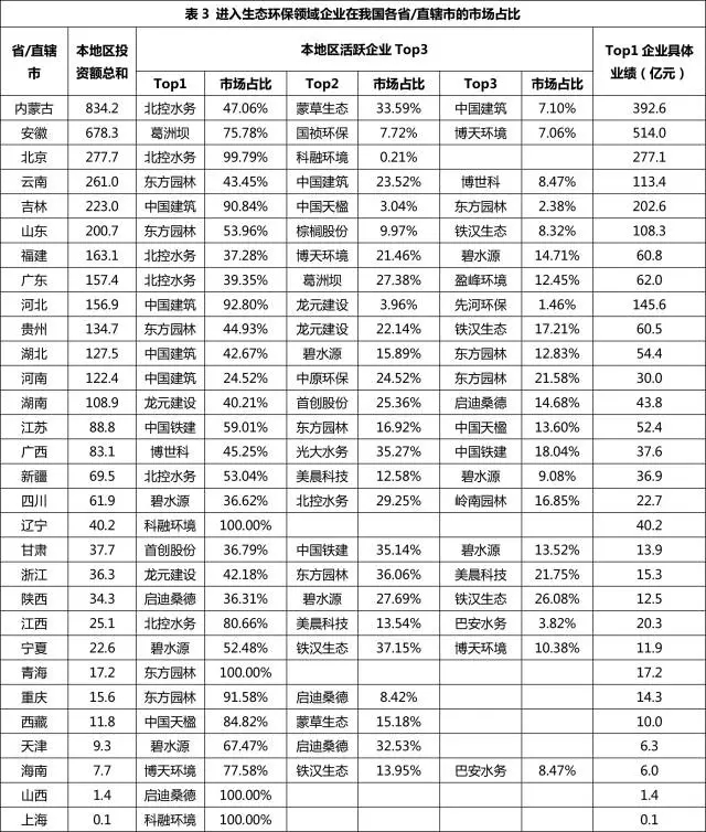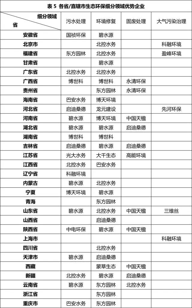全國(guó)各省/直轄市生態(tài)環(huán)保細(xì)分領(lǐng)域板塊的優(yōu)勢(shì)企業(yè)詳情見表5。