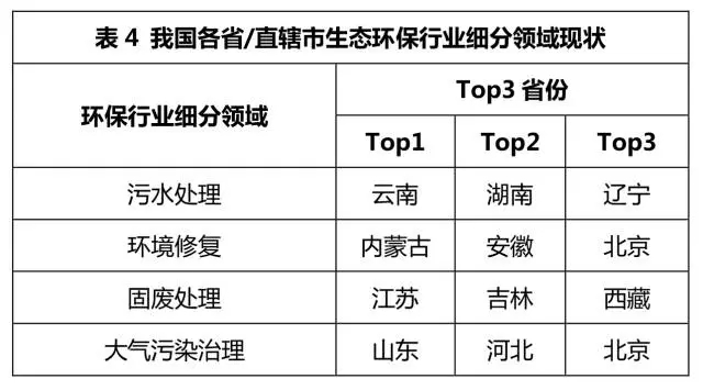 在各省/直轄市生態(tài)環(huán)保行業(yè)細(xì)分領(lǐng)域Top3的省份詳情見表4。