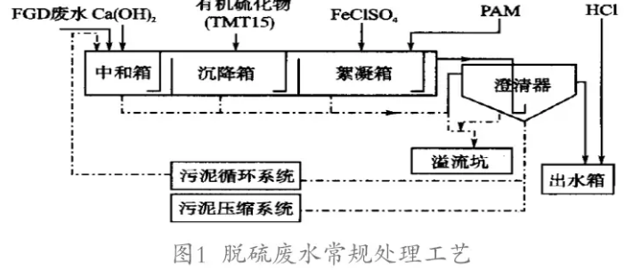 國內脫硫廢水常規(guī)處理工藝如下:一般采用加石灰中和、絮凝、沉降處理后,經(jīng)澄清、PH調節(jié)達標后回用或排放。