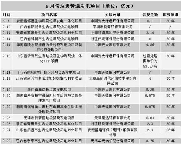 不僅如此,曾經(jīng)一周內(nèi)就有4個(gè)垃圾焚燒發(fā)電項(xiàng)目簽約成功。9月13日,上海環(huán)境公告稱,簽訂了蒙城縣垃圾焚燒發(fā)電PPP項(xiàng)目;9月14日,光大國(guó)際中標(biāo)海南陵水縣垃圾發(fā)電項(xiàng)目;9月15日,偉明環(huán)保表示,公司已經(jīng)拿下樟樹市生活垃圾焚燒項(xiàng)目建設(shè)運(yùn)營(yíng)標(biāo)的;9月19日,光大國(guó)際再奪浙江海鹽垃圾發(fā)電項(xiàng)目。