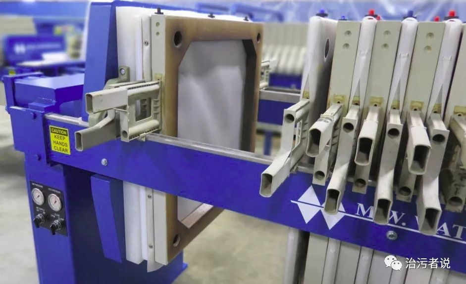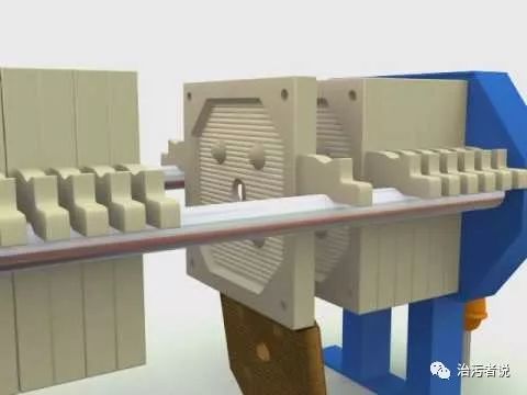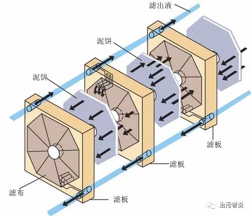 上圖可以看到濾布,濾板,泥餅,濾出液之間的關(guān)系??梢钥吹桨蹇蚴綁簽V機(jī)更像一臺(tái)不會(huì)轉(zhuǎn)動(dòng)的濾帶壓濾機(jī),通過固定在濾板上的濾布一次次擠壓,完成了污泥脫水的過程。