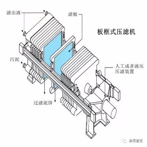 從壓濾機(jī)的示意圖可以看到,板框式壓濾機(jī)是由一張張濾板疊加而成的,濾板之間是有空間的,污泥注入這個(gè)濾板之間后,通過人工或者液壓的壓濾裝置,把污泥中的水分?jǐn)D壓出去,形成泥餅,擠壓出來的過濾液通過濾板上設(shè)置的濾出液管流出板框壓濾機(jī)外。