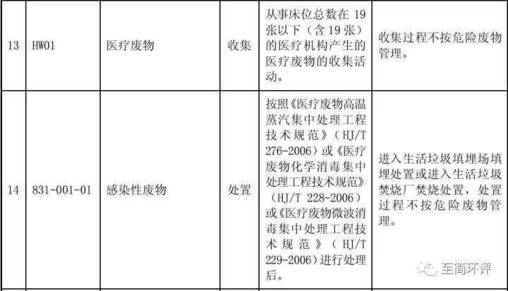 根據(jù)上文中將醫(yī)療廢水污泥歸類于醫(yī)療廢物中的“感染性廢物”(831-001-01),結(jié)合上表,豁免情況就很明朗了。即19張(含)床位數(shù)以下的醫(yī)療機構(gòu)產(chǎn)生的醫(yī)療廢物的收集活動,包括污泥,收集過程不按危險廢物管理;另外,感染性廢物,當然包括污泥處置環(huán)節(jié)不按危險廢物處理。