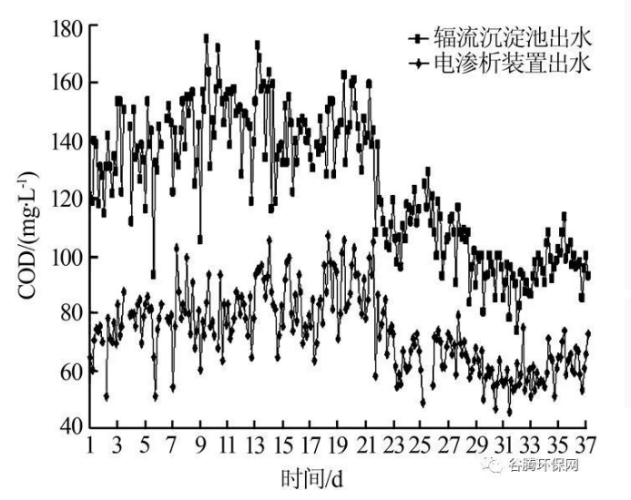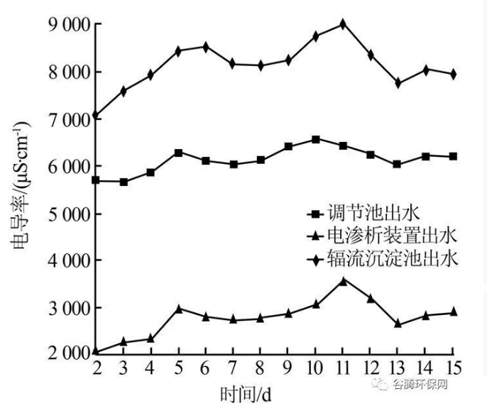 從圖3 可知, 在輻流沉淀池出水COD 平均為107.1 mg/L 條件下,電滲析裝置出水的COD 平均為77.84 mg/L,平均去除率為27.3%,說明多介質(zhì)過濾器、自清洗過濾器對(duì)輻流沉淀池出水COD 去除效果穩(wěn)定,可以保證電滲析裝置正常運(yùn)行。根據(jù)工程實(shí)際運(yùn)行工況,電滲析裝置的清洗周期一般為2 個(gè)月。從圖4 可知,該工藝的調(diào)節(jié)池出水、輻流沉淀池出水、電滲析裝置出水的電導(dǎo)率分別在5 672~6 573、7 090~9 002、2 127~3 600 μS/cm范圍內(nèi)。由于在Fenton 反應(yīng)器進(jìn)水投加硫酸、絮凝反應(yīng)池進(jìn)水投加NaOH,導(dǎo)致輻流沉淀池出水平均電導(dǎo)率較調(diào)節(jié)池出水高31.4%,但經(jīng)過初次脫鹽后,電滲析裝置出水平均電導(dǎo)率較調(diào)節(jié)池出水低53.2%,脫鹽效果顯著,緩解了后續(xù)反滲透膜的脫鹽壓力。
