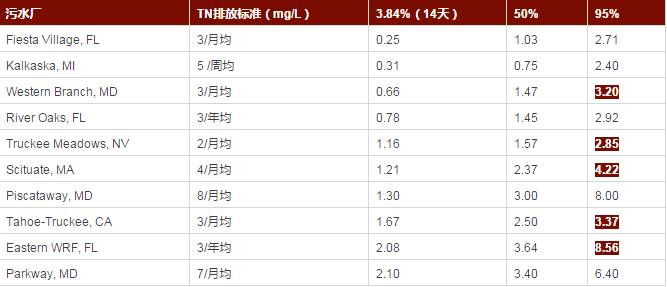 同時,在上述統(tǒng)計分析過程中,TPS-14d與TPS-50%、TPS-95%的比值也是一個有趣的現(xiàn)象,對于TN和TP,TPS-14d約為TPS-50%的40~60%,TPS-95%約為TPS-50%的200~300%,這充分說明即使在美國最好的脫氮除磷污水處理廠(相當(dāng)一部分是達(dá)到極限脫氮除磷標(biāo)準(zhǔn))其出水氮磷水質(zhì)也存在較大的波動性。