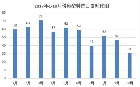 首先,我們看一下,2017年1-10月國內(nèi)廢塑料進(jìn)口量變化情況(單位:萬噸)