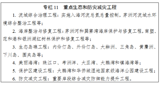 灣區(qū)重點開展吳川砂質(zhì)海岸保護與修復(fù)工程、廉州灣、湛江港、南三島紅樹林、徐聞珊瑚礁保護與修復(fù)工程;推進南三島生態(tài)島礁工程和湛江港、雷州灣、安鋪港美麗海灣建設(shè);開展特呈島和雷州烏石國家級海洋公園建設(shè)和湛江東海島石化基地海洋災(zāi)害防御能力提升工程。