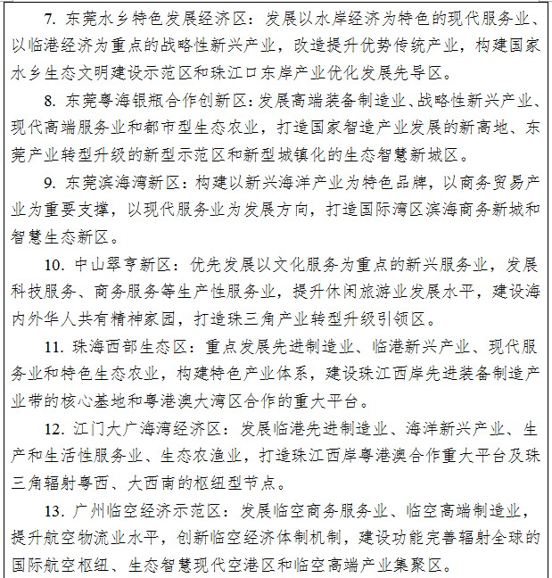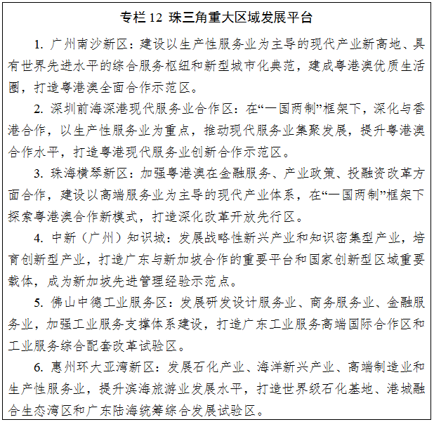 產(chǎn)業(yè)發(fā)展。積極落實粵港澳大灣區(qū)發(fā)展戰(zhàn)略,發(fā)揮深圳、廣州龍頭帶動作用,大力推進廣深科技創(chuàng)新走廊建設(shè),形成高度發(fā)達的創(chuàng)新經(jīng)濟帶,輻射帶動全省創(chuàng)新發(fā)展。打造全球產(chǎn)業(yè)創(chuàng)新高地,建設(shè)具有國際影響力的戰(zhàn)略性新興產(chǎn)業(yè)高地、信息經(jīng)濟高地、智能制造高地,重點布局在深圳、廣州、珠海等地。建設(shè)世界級先進的電子信息、裝備制造、石化等產(chǎn)業(yè)基地,重點布局在佛山、惠州、東莞、中山、江門等。重點打造全球金融中心、全球貿(mào)易中心、全球物流中心、國際化的消費中心、世界休閑旅游中心,主要布局在廣州、深圳。大力發(fā)展廣深珠高端制造業(yè),支持珠海培育智能制造和戰(zhàn)略性新興產(chǎn)業(yè),帶動珠江西岸產(chǎn)業(yè)發(fā)展。大力建設(shè)佛山和東莞科技成果轉(zhuǎn)化基地。建設(shè)惠州、中山、江門等區(qū)域生產(chǎn)制造基地。加快構(gòu)筑區(qū)域發(fā)展重大平臺。建設(shè)南海油氣資源勘探開發(fā)保障基地,加快推進天然氣水合物產(chǎn)業(yè)發(fā)展;推動江門循環(huán)經(jīng)濟和環(huán)保產(chǎn)業(yè)示范區(qū)建設(shè);在港口、桂山、金灣等海域發(fā)展海上風(fēng)電。