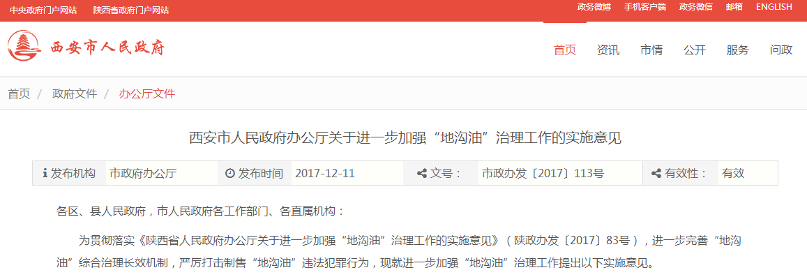 西安市人民政府辦公廳關(guān)于進(jìn)一步加強“地溝油”治理工作的實施意見