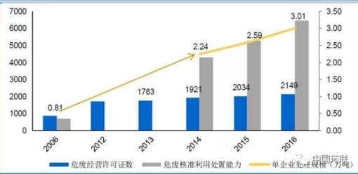 根據(jù)《固體廢物污染環(huán)境防治法執(zhí)法檢查報(bào)告》顯示,2016年全國(guó)持危險(xiǎn)廢物經(jīng)營(yíng)許可證的單位設(shè)計(jì)處置能力為6471萬(wàn)噸,實(shí)際經(jīng)營(yíng)規(guī)模只有1629萬(wàn)噸,實(shí)際處理比例僅為25%。