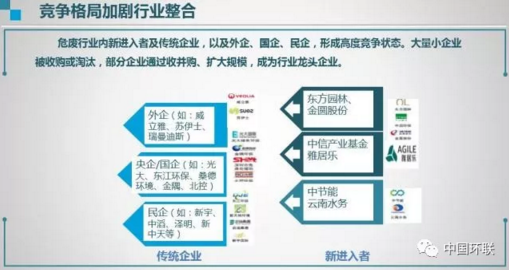 危廢市場(chǎng)格局是危廢行業(yè)內(nèi)新進(jìn)入者及傳統(tǒng)企業(yè),及外企、國(guó)企、民企,形成高度競(jìng)爭(zhēng)狀態(tài)。在環(huán)保調(diào)控力度加強(qiáng)的情況下,很多資本躍躍欲試,進(jìn)入危廢處置行業(yè),包括一些大型集團(tuán),房地產(chǎn)企業(yè),綠化企業(yè),或者投資機(jī)構(gòu)等。企業(yè)跑馬圈地和異地收購(gòu)將會(huì)持續(xù)下去,搶占危廢市場(chǎng)或?qū)⒂萦遥罅啃∑髽I(yè)被收購(gòu)或淘汰,部分企業(yè)通過(guò)收并購(gòu)、擴(kuò)大規(guī)模,成為行業(yè)龍頭企業(yè)。