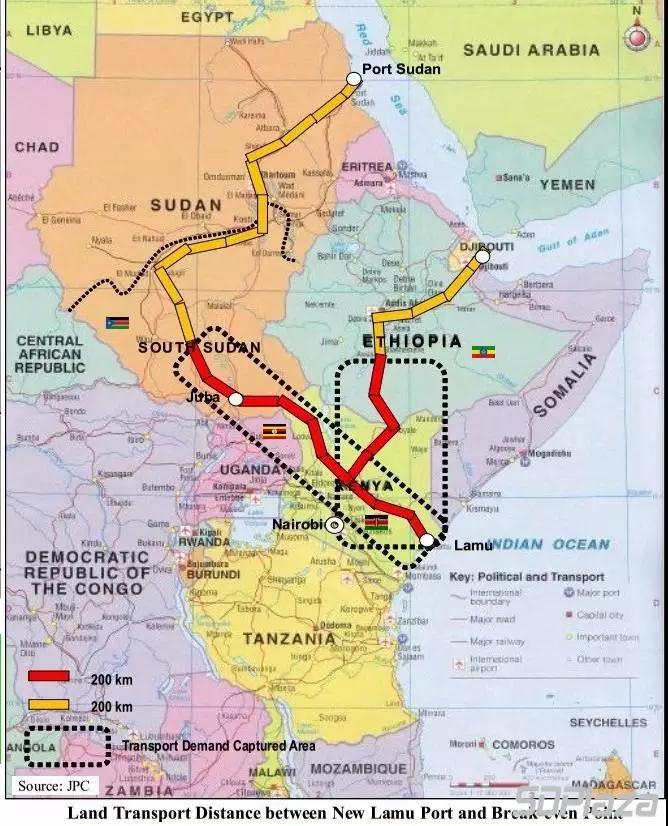 肯尼亞拉穆港-南蘇丹-埃塞俄比亞交通走廊項(xiàng)目(LAPSSET)耗資約250億美元,被認(rèn)為是非洲國家獨(dú)立以來“非洲大陸最大工程”。該項(xiàng)目計(jì)劃建造一個(gè)擁有32個(gè)泊位的深水港,并建設(shè)連接港口與南蘇丹首都朱巴以及埃塞俄比亞首都亞的斯亞貝巴的高速公路、鐵路與輸油管道。新港口將配套建設(shè)煉油廠、倉庫等基礎(chǔ)設(shè)施,此外,還包括在拉穆(Lamu Islands)、伊西奧洛(Isiolo)、洛基察吉奧(Lokichogio)建設(shè)三個(gè)國際機(jī)場。