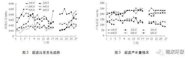由圖 2 可看出 1# UF 和 2# UF 超濾壓差偏高,平均壓差在0.03 MPa,由于 1# UF 和 2# UF 為2012 年投用,運(yùn)行周期較長(zhǎng),膜表面變得粗糙,膜絲斷損嚴(yán)重;3# UF~6# UF 為 2015 年 6 月投運(yùn),運(yùn)行狀況良好,平均壓差在 0.018 MPa。1# UF 和2# UF 產(chǎn)水量較低,平均在 135 m3 /h,運(yùn)行周期長(zhǎng),膜通量也降低,3# UF~6# UF 產(chǎn)水量平均在210 m3/h,均滿足設(shè)計(jì)回收率。