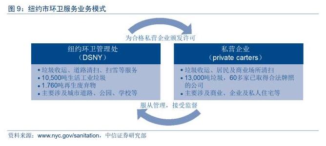 以紐約市為例,其環(huán)衛(wèi)服務(wù)業(yè)由政府環(huán)衛(wèi)管理處與私營垃圾運(yùn)輸公司共同運(yùn)營,但私營公司受到環(huán)衛(wèi)管理處監(jiān)管,并要遵守相關(guān)地方規(guī)范。紐約市環(huán)衛(wèi)管理處(DSNY)主要職責(zé)是垃圾收運(yùn)、道路清潔和清雪,它是世界上最大的環(huán)衛(wèi)管理處,負(fù)責(zé)每天收運(yùn)紐約市的10,500噸生活垃圾和工業(yè)垃圾以及1,760噸再生廢棄物。紐約市另外13,000噸垃圾由私營垃圾運(yùn)輸公司(PrivateCartingCompanies)進(jìn)行收運(yùn),環(huán)衛(wèi)管理處對這些私人運(yùn)營負(fù)責(zé)行使監(jiān)督管理職責(zé),并發(fā)布其需要遵守的法律法規(guī)。