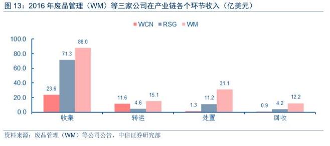 美國環(huán)衛(wèi)市場為典型的一體化模式,相關(guān)企業(yè)在大力參與前端收集&轉(zhuǎn)運(yùn)業(yè)務(wù)同時,后端處置及資源回收領(lǐng)域也積極布局和參與,以充分發(fā)揮協(xié)同和提升公司競爭優(yōu)勢。從廢品管理(WM)等三家全國性市政廢物管理公司的2016年收入構(gòu)成看,收集&轉(zhuǎn)運(yùn)業(yè)務(wù)收入分別占到三家公司2016年內(nèi)部抵消前總營業(yè)收入的63%、75%和94%,后端處置分別站到合并抵消前營業(yè)收入的19%、19%和4%。