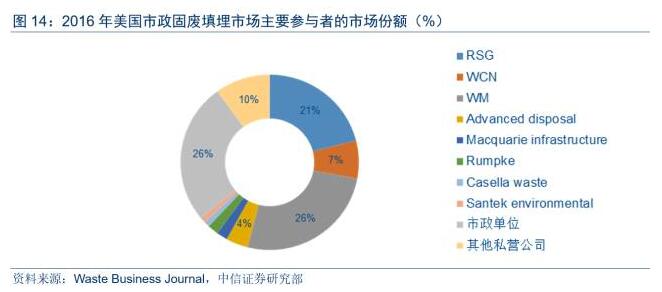 廢品管理(WM)等美國三大環(huán)衛(wèi)龍頭公司除在前端收集及轉(zhuǎn)運(yùn)已經(jīng)牢牢樹立壟斷地位外,多年來通過在后端處置環(huán)節(jié)的持續(xù)大力參與,目前在填埋環(huán)節(jié)的領(lǐng)先優(yōu)勢也異常明顯。2016年,三大環(huán)衛(wèi)公司在填埋市場份額占比合計高達(dá)54%,WM、RSG及WCN在市政廢物總填埋量中占比分別為26%、21%、7%,填埋市場的寡頭壟斷特征突出。