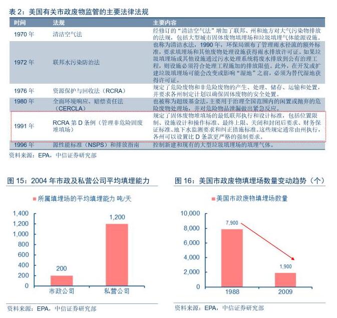 上世紀(jì)90年代,美國市政廢物填埋場曾經(jīng)爆發(fā)大氣、土壤、水源污染一系列環(huán)境污染問題,導(dǎo)致居民對于社區(qū)周邊建設(shè)和運(yùn)營垃圾填埋場的反對聲音日益高漲。針對上述環(huán)境問題,1991年,專門用于監(jiān)管非危廢填埋場的《資源保護(hù)與回収法》D條例頒布,大幅提升了市政廢物填埋場的設(shè)計、運(yùn)營及環(huán)保等標(biāo)準(zhǔn)。受此影響,大量靠近社區(qū)或運(yùn)營不達(dá)標(biāo)的填埋場在上世紀(jì)90年代被迫關(guān)停,且填埋場的建設(shè)和運(yùn)營成本上升明顯。根據(jù)EPA的統(tǒng)計,美國市政廢物填埋市場數(shù)量自1988年的7,900座下滑約75%至2009年的1,900座,填埋場數(shù)量降幅明顯。