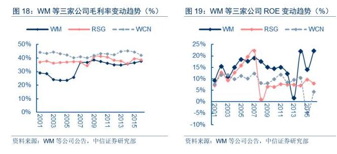 美國環(huán)衛(wèi)龍頭公司的毛利率及凈資產(chǎn)收益率(ROE)等財務(wù)指標(biāo)持續(xù)表現(xiàn)突出。在2007~2016年的過去10年中,廢品管理(WM)、共和服務(wù)(RSG)、廢物聯(lián)合公司(WCN)的毛利率全部維持在35%之上,其中廢物聯(lián)合公司(WCN)長期維持在40%之上。從凈資產(chǎn)收益率看,上述三家公司的凈資產(chǎn)收益率過去10年的均值分別為15%、8%和8%,其中廢品管理公司的凈資產(chǎn)收益率顯著超出其他兩家公司,主要是因為相比兩個競爭對手,公司擁有更高的資產(chǎn)周轉(zhuǎn)率和財務(wù)杠桿。