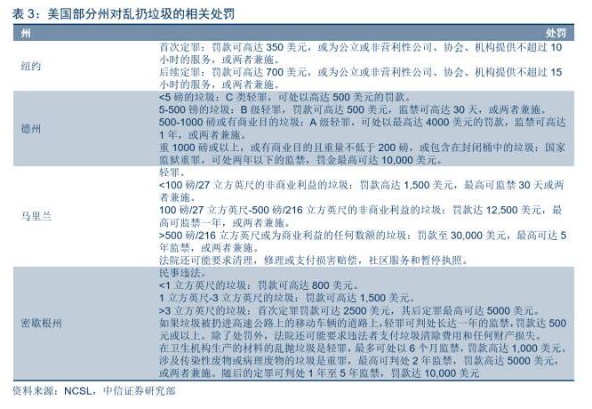 目前在美國,道路清掃業(yè)務(wù)市場規(guī)模相比清運(yùn)和清理而言幾乎可以忽略不計,主要原因是美國道路清掃需求較低,這和國內(nèi)環(huán)衛(wèi)市場以清掃為主的現(xiàn)狀存在顯著差異。美國亂扔垃圾是一種犯罪行為,50個州均制定禁止亂扔垃圾的法律,罰款范圍從科羅拉多州的20美元到馬里蘭州的30,000美元,且在更嚴(yán)重情況下會處以監(jiān)禁,比如說在愛達(dá)荷州的刑期為10天,在田納西州高達(dá)6年。對亂扔垃圾嚴(yán)格立法導(dǎo)致美國道路較為整潔,大多數(shù)城市的道路清掃頻率為每周一次,部分城市甚至每個月做一次道路清掃,道路清掃的需求非常低,相應(yīng)導(dǎo)致清掃業(yè)務(wù)市場規(guī)模比較小。