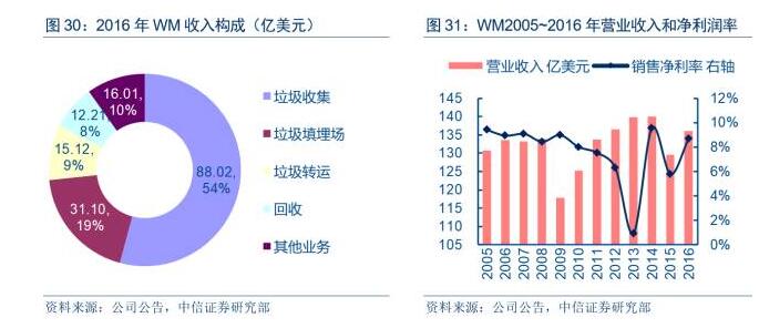 廢品管理(WM)是北美規(guī)模最大固廢處理公司,目前共擁有2.2萬輛垃圾收集車輛,4.12萬名員工,262個填埋場,310個固廢中轉(zhuǎn)站,120家資源回收中心和17家垃圾焚燒發(fā)電廠,服務(wù)美國、加拿大和波多黎各等2,700萬戶工商業(yè)和居民客戶。2016年,公司營收規(guī)模為136.09億美元,凈利潤為11.82億美元,目前市值約330億美元,是標(biāo)普500指數(shù)成分股。