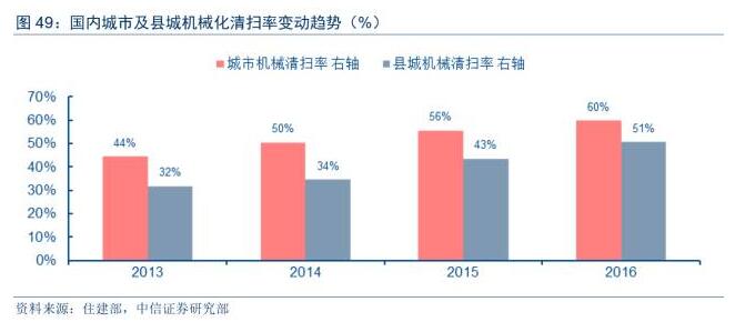 從國內(nèi)機(jī)械化率變動趨勢看,近年來持續(xù)處于快速提升趨勢中,其中城市機(jī)械化清掃率從2013年的44%提升至2016年的60%,縣城機(jī)械化清掃率從2013年的32%提升至2016年的51%,2013~2016年平均分別提升5個及6個百分點。參考海外環(huán)衛(wèi)全部機(jī)械化作業(yè)的發(fā)展經(jīng)驗,國內(nèi)機(jī)械化率提升仍有較大提升空間。