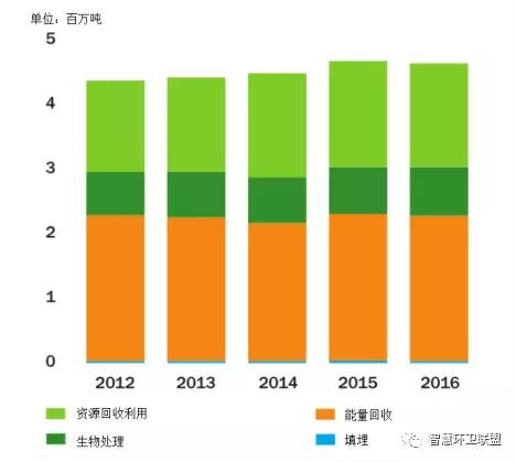 *圖表中以各種處置方法為目的進(jìn)行的收集量與各種方法的實(shí)際處置量間存在一定的差別。對資源回收利用和厭氧消化來說,收集量和處置量存在差別的原因是,一部分廢物在達(dá)到處理階段后被發(fā)現(xiàn)不符合處理的要求,通常都會在焚燒廠接受能量回收處理,因此也是能量回收的處理量稍稍高于以此為目的的收集量的原因。建筑垃圾資源回收的實(shí)際處理量要高于收集量,原因是焚燒廠產(chǎn)生的金屬和底灰會在分類后,得到循環(huán)利用。近年來,實(shí)際接受填埋處理的廢物量要原告于以填埋為目的而進(jìn)行收集的量,主要原因之一是焚燒廠能量回收會產(chǎn)生大量飛灰,只能接受填埋處置。