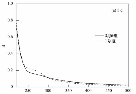 堆肥過(guò)程中DOM的變化被認(rèn)為是能靈敏反映堆肥腐熟狀況的重要指標(biāo),與堆肥的固相組分相比更具代表性,因此本實(shí)驗(yàn)采用紫外-可見(jiàn)光譜共堆肥過(guò)程中DOM的光譜特征進(jìn)行了分析,而由前面的實(shí)驗(yàn)結(jié)果可知,1號(hào)瓶的整體堆肥效果最佳,因此將1號(hào)瓶中的堆體與對(duì)照組進(jìn)行了分析,結(jié)果如圖5所示。