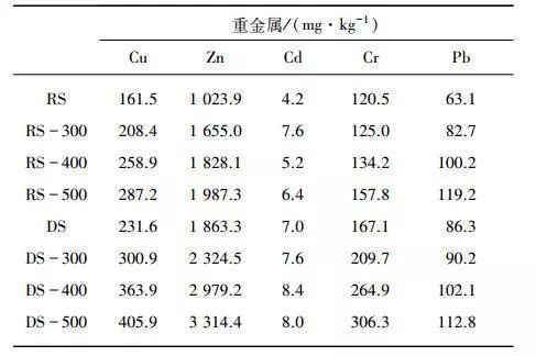 表2為生污泥和消化污泥中Cu、Zn、Cd、Cr、Pb五種重金屬元素總量。由表2可知,污泥中5中重金屬元素含量順序?yàn)椋篫n>Cu>Cr>Pb>Cd。一般而言我國污泥中含有較高濃度的Zn和Cu,而含有較低濃度的Cd。厭氧消化后污泥中各金屬含量相比原污泥有較大的增長,這也導(dǎo)致同等溫度下消化污泥熱解炭中五種重金屬含量均高于生污泥熱解炭,其中消化污泥熱解炭中重金屬Cr、Zn、Cu約為生污泥熱解炭的1.5倍。