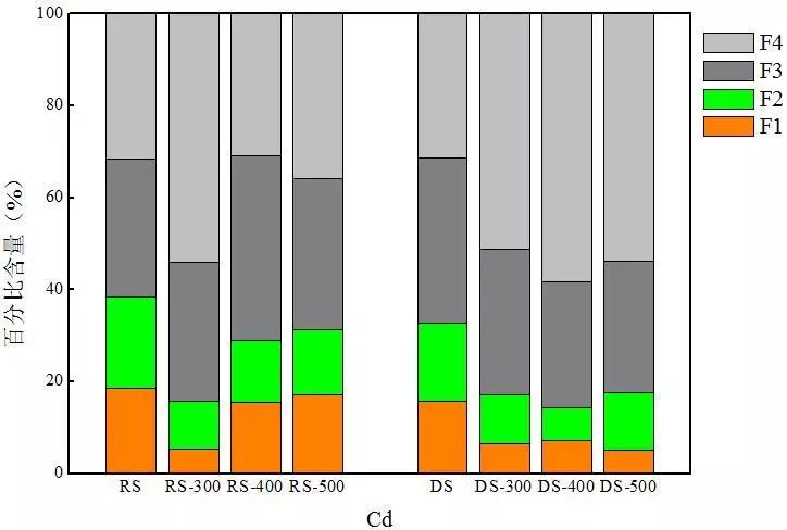 對比兩種熱解炭中Cr的分布可以發(fā)現(xiàn),消化污泥熱解炭中穩(wěn)定態(tài)Cr含量均高于同等溫度下生污泥熱解炭,尤其是F3態(tài)Cr的含量。以300 ℃熱解炭為例,RS-300和DS-300中F3態(tài)Cr的含量分別為35.4%和49.7%。這可能是因?yàn)樯勰嘀泻写罅康暮蚧衔?S含量達(dá)到1.97%),在厭氧環(huán)境下Cd更易形成硫化物,使消化污泥中F3態(tài)含量高于生污泥,從35.5%增加到53.5%,進(jìn)而導(dǎo)致消化污泥熱解炭中F3態(tài)Cr含量高于生污泥熱解炭。