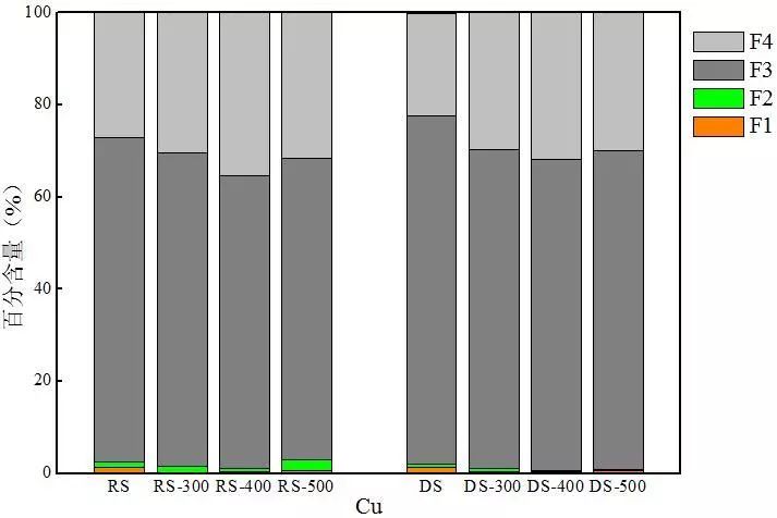 熱解后,兩種熱解炭中非穩(wěn)態(tài)Cu含量均有不同程度的降低,因此可以推斷經(jīng)過熱解后F1和F2態(tài)轉(zhuǎn)化為F3或F4態(tài)。在400 ℃熱解條件下熱解炭中穩(wěn)定態(tài)Cu含量最大,在500 ℃下熱解炭中殘?jiān)鼞B(tài)Cu相對于400 ℃會有小幅度降低,低溫對污泥中Cu的鈍化效果較佳。