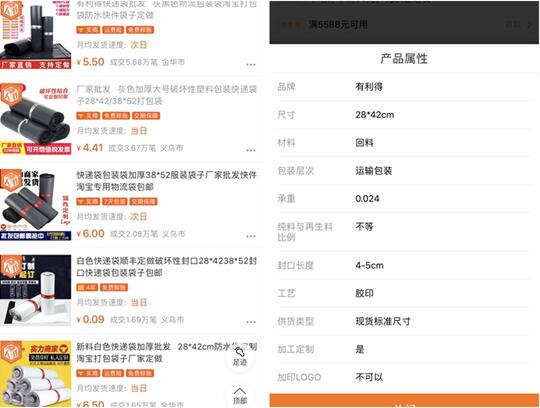在阿里巴巴的1688采購(gòu)批發(fā)平臺(tái)上,記者也得到了相關(guān)印證。通過對(duì)關(guān)鍵詞“快遞袋”的搜索,數(shù)十家生產(chǎn)廠家排列開來(lái),選取用按銷量排序,最高的則成交累計(jì)成交300余萬(wàn)包,其快遞袋的明顯來(lái)源為“回料”,即回收料。