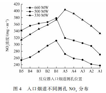 2)在660、500、330MW負荷下,反應器入口煙道NOx均值偏差分別為13.4%、17.1%、18.1%,而速度均值偏差分別為6.1%、6.4%、6.6%。不同測孔位置濃度場分布差異性較大,是噴氨格柵優(yōu)化調(diào)整的一個不可忽視的重要因素,而反應器入口速度場分布相對均勻,對噴氨格柵優(yōu)化調(diào)整影響較小。