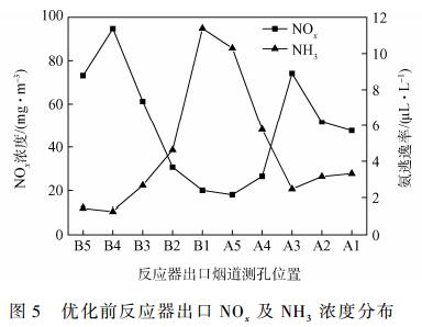 從圖5可以看出,根據(jù)出口NOx濃度和氨逃逸濃度的對應關(guān)系,NOx濃度較低的區(qū)域?qū)^大的噴氨量,極易產(chǎn)生較大氨逃逸濃度。B1、A5等2個測孔位置出口NOx濃度均小于20mg?m-3,其代價是很大的噴氨量和較高的氨逃逸。