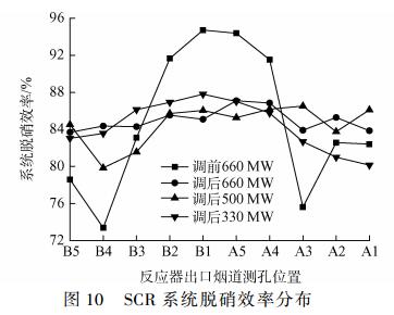 調(diào)后機組660MW負荷下,脫硝效率B側(cè)介于83.7%~85.5%,A側(cè)介于83.9%~87.1%,系統(tǒng)平均為85.0%。調(diào)后機組500MW負荷下,脫硝效率B側(cè)介于79.8%~86.1%,A側(cè)介于83.8%~86.5%,系統(tǒng)平均為84.6%。調(diào)后機組330MW負荷下,脫硝效率B側(cè)介于83.0%~87.8%,A側(cè)介于80.1%~87.0%,系統(tǒng)平均為84.4%。3種工況負荷下,系統(tǒng)總效率基本與調(diào)前持平,但效率峰谷差異大幅下降。