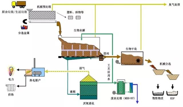 工藝全過程分為四個(gè)階段:機(jī)械預(yù)處理、淋濾處理 – 整個(gè)處理過程的核心步驟、生物干化、機(jī)械分選和 RDF 生產(chǎn)。