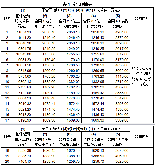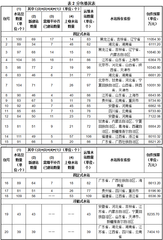 7. 招標(biāo)內(nèi)容為:招標(biāo)人計劃采購1087個國家地表水自動監(jiān)測站(以下簡稱水站)的建設(shè)及其三年運維服務(wù)、531個已建水站的三年運維服務(wù)、135個國家已建水站的儀器設(shè)備填平補齊。其中,1~18包為固定式水站,19~20包為浮船式水站。具體要求詳見第四章技術(shù)需求書。