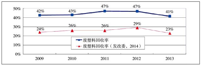 廢塑料是生活垃圾可回收物中增長最快的部分。根據(jù)《中國資源綜合利用年度報告(2014),國家發(fā)展改革委員會》公布的數(shù)據(jù)(見下表),2009~2013年我國廢塑料回收利用率為23%~29%。