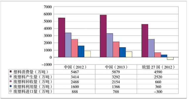 扣除廢塑料焚燒回收利用部分,中國內(nèi)地廢塑料回收利用率明顯高于歐盟。以2012年數(shù)據(jù)作為對比,中國內(nèi)地廢塑料回收量是1600萬噸,廢塑料回收率是46.9%,進口廢塑料量是888萬噸,合計回收廢塑料是2488萬噸,廢塑料使用量占當年塑料消費量比例為45.5%;而2012年,歐盟(27國)廢塑料回收量是660萬噸,廢塑料回收率是26%,歐盟回收的廢塑料45%約300萬噸用于出口(其中87%出口到中國大陸),實際歐盟本土廢塑料使用量約360萬噸,廢塑料使用量占當年塑料消費量比例為8%。