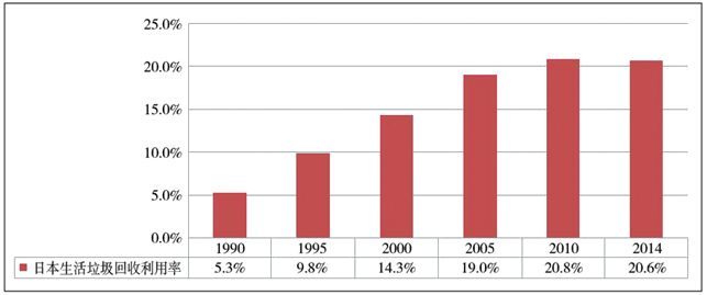 圖141990~2014年日本生活垃圾回收利用率