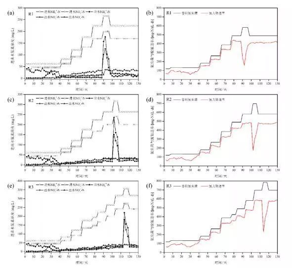 能厭氧氨氧化污泥富集培養(yǎng)過程中,為考察鐵離子的影響,反應器保持同步容積氮負荷提升,直至運行穩(wěn)定。反應器R1、R2、R3進出水氮素指標、容積氮負荷及氮去除速率如圖2所示。