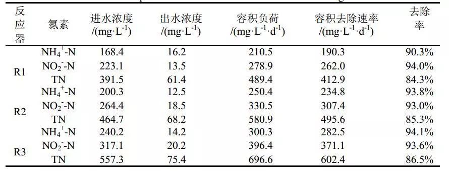 在厭氧氨養(yǎng)護污泥富集培養(yǎng)中,由于厭氧氨氧化菌生長緩慢,反應器容積負荷有限。許多研究證明了高氮素基質對厭氧氨氧化菌的抑制作用。Strous等研究表明亞硝酸鹽濃度達到100 mg/L,即可強烈抑制厭氧氨氧化菌活性;本研究以出水亞硝酸鹽濃度高于100 mg/L作為反應器超過可承受負荷并失穩(wěn)的依據(jù)。對照組R1在運行90 d時,容積氮負荷超出反應器承受極限,出水NH4+-N和NO2--N濃度急劇升高,類似失穩(wěn)現(xiàn)象也出現(xiàn)在試驗組R2(第102 d)、R3(第114 d)。反應器失穩(wěn)后,降低進水基質氮濃度,同時加大回流比以解除基質自抑制;由于EGSB反應器抗沖擊負荷能力強,反應器很快恢復穩(wěn)定運行。穩(wěn)定階段反應器運行狀況如表2所示。Chen等通過批次試驗證明了3.68 mg/L的鐵離子添加下,比厭氧氨氧化活性可提高533.2%;長期試驗證明,鐵離子的添加,相較于控制組,提升了19.5%的反應器容積負荷,與本研究結果類似。