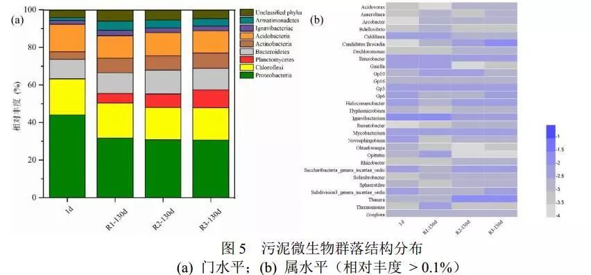 圖5(b)為污泥微生物屬水平熱圖??梢钥闯?,厭氧氨氧化菌Candidate Brocadia明顯富集;接種污泥中Candidate Brocadia菌難以檢測其豐度(< 0.01%),經(jīng)130 d的富集培養(yǎng),對照組R1污泥樣品中厭氧氨氧化菌Candidate Brocadia相對豐度為4.2%,而試驗組R2、R3污泥樣品中其豐度分別為6.8%、8.2%,高于對照組R1。