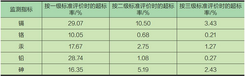 表1 土壤環(huán)境質(zhì)量主要重金屬監(jiān)測指標(biāo)超標(biāo)率統(tǒng)計(jì)表