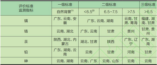 注:(1):一級標(biāo)準(zhǔn)體現(xiàn)土壤自然背景值,不區(qū)分土壤pH值;(2):二級標(biāo)準(zhǔn)按土壤pH值不同區(qū)分,三級標(biāo)準(zhǔn)pH值大于6.5。