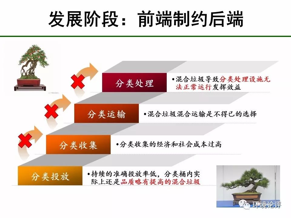 我國2000年開始在8個(gè)試點(diǎn)城市開始推行垃圾分類,總體而言進(jìn)展緩慢,收效甚微,飽受社會(huì)質(zhì)疑與批評(píng),其中一個(gè)主要原因就是尚未建成現(xiàn)代化、多樣化的垃圾處理設(shè)施,即使居民做到了源頭分類,環(huán)衛(wèi)企業(yè)也做不到分類收集和分類運(yùn)輸,最終只能“殊途同歸”,進(jìn)入垃圾填埋場(chǎng)。部分小區(qū)采取各種激勵(lì)和監(jiān)督措施后形成的一些示范案例,盡管在營造氛圍、培養(yǎng)習(xí)慣和方便拾荒者方面有一定意義,但歸根到底只是一些點(diǎn)綴性的盆景,尚未形成園林,遑論森林。這一階段是垃圾分類的起步階段,其基本特點(diǎn)是“后端決定前端”,即后端分類處理設(shè)施的缺乏,決定了前端分類收集徒具形式,“混收混運(yùn)”廣受詬病,但客觀上難以避免。