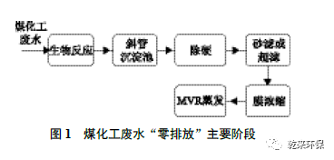 隨著環(huán)保政策的收緊,國家對已建和新建的煤化工項目要求廢水“零排放”。雖然不同煤化工工藝產(chǎn)生的廢水性質(zhì)有所差異,但傳統(tǒng)處理煤化工廢水的工藝大多包括生物活性處理、化學(xué)沉淀、懸浮物過濾、膜濃縮產(chǎn)水回用和蒸發(fā)固化等。圖1 為煤化工廢水“零排放”主要階段示意。
