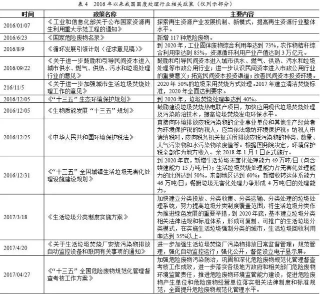 《“十三五”全國城鎮(zhèn)生活垃圾無害化處理設(shè)施建設(shè)規(guī)劃》助推垃圾焚燒發(fā)電行業(yè)快速發(fā)展;最新頒布的《國家危險廢物名錄》對于危廢的識別更加清晰,危廢處理更加有據(jù)可循;《環(huán)境保護稅法》于2018年1日1日正式施行,“排污費改稅”有利于引導(dǎo)排污單位減少污染物排放;《納入排污許可管理的火電等17個行業(yè)污染物排放量計算方法(試行)》和《未納入排污許可管理行業(yè)適用的排污系數(shù)、物料衡算方法(試行)》是全面細化和保障環(huán)保稅法實施的綜合性配套法規(guī),進一步明確環(huán)保稅稅制要素。