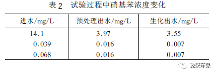 由表1可見,該預(yù)處理工藝有較好的除磷效果,經(jīng)生化處理后PO3 +4達(dá)到二級(jí)排放的水平。另外由表2 可見預(yù)處理對(duì)硝荃苯的去除也有很好的效果。