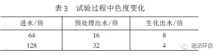 2. 4. 5 預(yù)處理對(duì)鐵和色度的去除:通常鐵鹽可以改善活性污泥的沉降性能。在本次試驗(yàn)中發(fā)現(xiàn),生物膜的固著性能大大提高,大量的生物膜固定在懸浮填料上,使曝氣池中幾乎無(wú)懸浮污泥,處理水清沏透明。經(jīng)過(guò)曝氣池,F(xiàn)e2 + 被氧化成Fe3 + ,沉淀去除。試驗(yàn)測(cè)得生化段出水總鐵離子濃度為3. 85—8. 55mg/L,滿足二級(jí)排放要求。催化鐵內(nèi)電解法具有顯著的脫色效果(見表3 )。